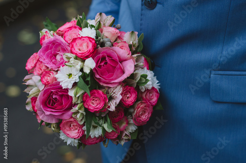 Pink rose flowers and green chrysanthemums bouquet on brown concrete stair. Pink is a popular nuptial color synonymous with romance. Wedding flowers photographs, pictures of bridal bouquets, brides. Red, pink, green, & gold wedding. Beautiful fresh soft wedding decorative round shape bouquet of pink rose white peony and green flowers lying on black glossy background outdoor, horizontal picture.