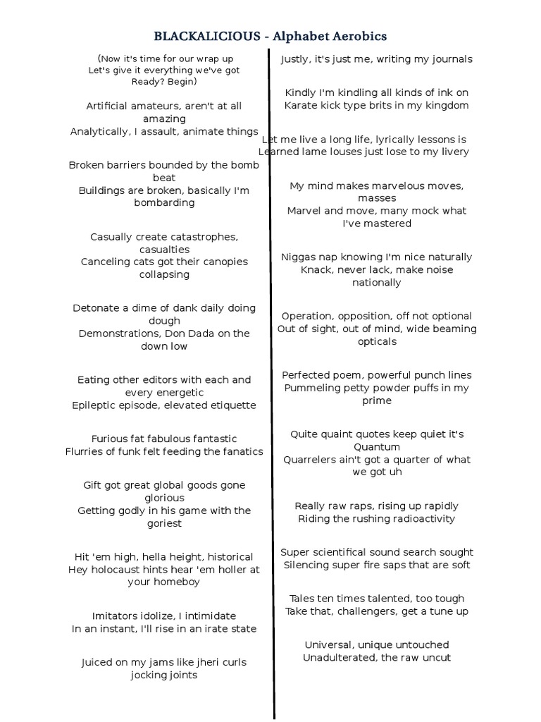 Alphabet aerobics lyrics von blackalicious mit video: Das musikvideo mit der audiospur des songs startet automatisch . Also see camelot, duration, release date, label, popularity, energy, . Daniel radcliffe raps blackalicious' alphabet aerobics. watch: Alphabet aerobics lyrics, blackalicious, (now it's time for our wrap up let's give it everything.
